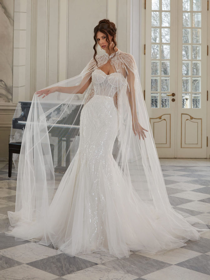 Το νυφικό Poppy 2636 2636 είναι ένα εντυπωσιακό σχέδιο γοργόνας με στράπλες μπούστο, κεντημένο εξ ολοκλήρου με παγιέτες, που αγκαλιάζει κομψά τη σιλουέτα. Οι διακριτικές διάφανες λεπτομέρειες στα πλαϊνά αναδεικνύουν τη θηλυκότητα, ενώ η φούστα από απαλό τούλι ανοίγει ρευστά προς τα κάτω και καταλήγει σε ουρά. Η αποσπώμενη τούλινη κάπα με κεντημένες λεπτομέρειες προσθέτει μια αίσθηση θεατρικής κομψότητας και ρομαντισμού.